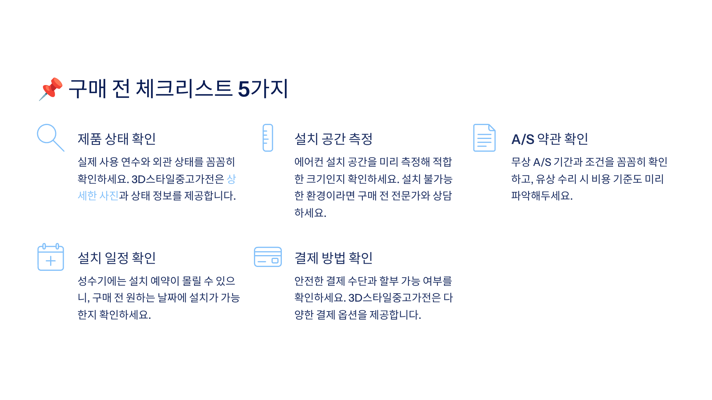 해당 콘텐츠는 중고에어컨 구입을 고려하는 소비자에게 정보를 제공하기 위한 목적이며, 실제 구매 및 설치 조건은 업체 사정에 따라 달라질 수 있습니다. 정확한 정보는 반드시 판매처에서 확인해 주세요.